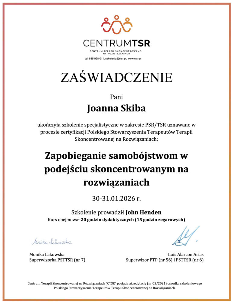 - Terapia Skoncentrowana na Rozwiązaniach. Szkolenie TSR I stopnia. Centrum Rozwiązań Terapii Skoncentrowanej na Rozwiązaniach Toruń.